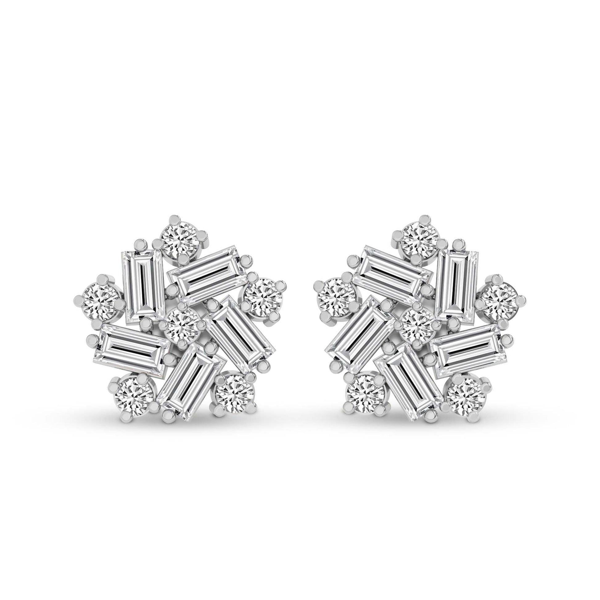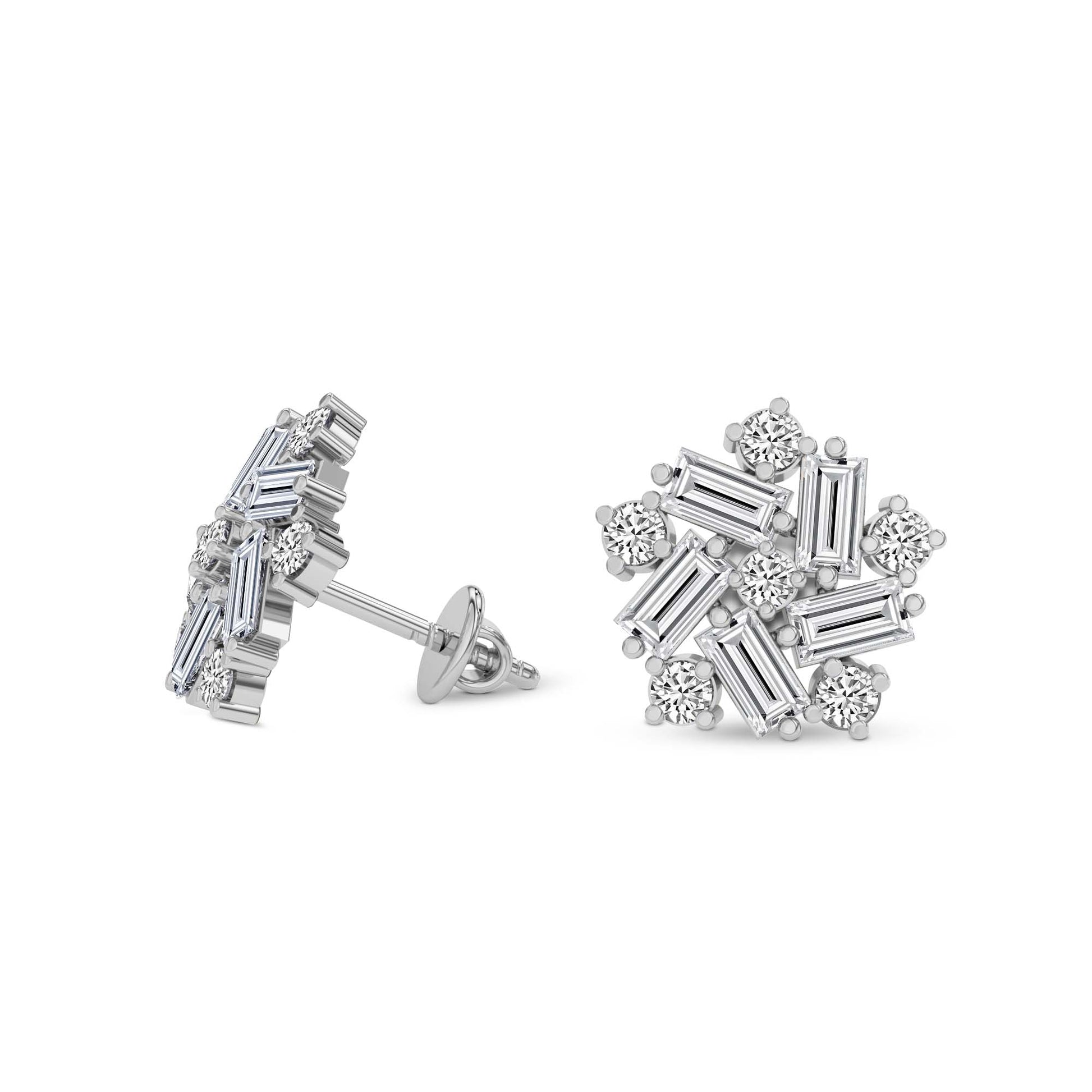 Diamond Type: Lab Grown Diamond, Diamond Weight: 2.26 Carat, No. of Stones: 24, FG Color, VS Clarity, Certification: IGI Certified, BIS - Hallmarked gold, Diamond Shape: Baguette & Round, Metal Color : White, Gold Weight : 2.38 grams, Exquisitely crafted to deliver both luxury and ease, these earrings offer a refined sparkle that enhances your style from morning meetings to evening soirées — without compromising on comfort.