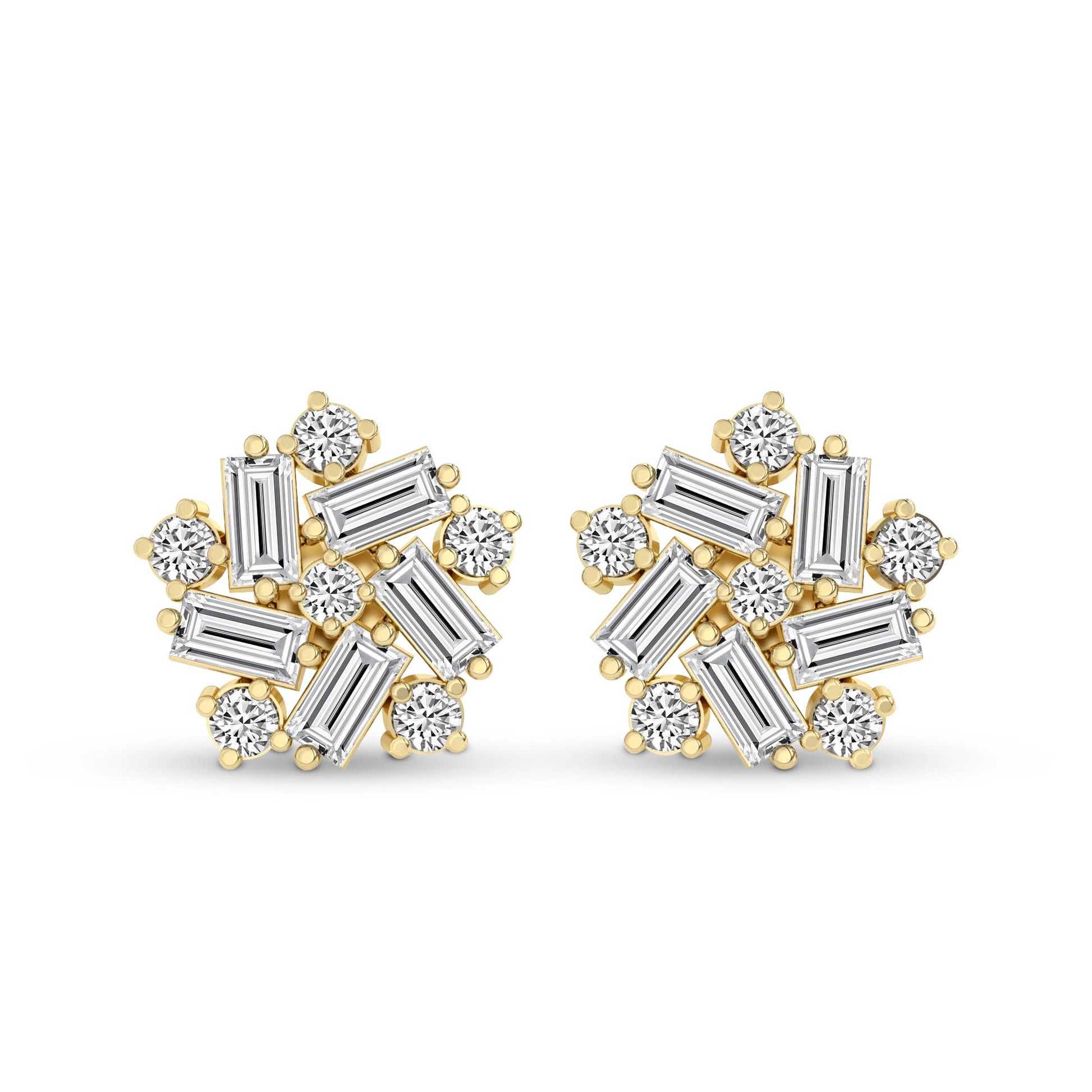 Diamond Type: Lab Grown Diamond, Diamond Weight: 2.26 Carat, No. of Stones: 24, FG Color, VS Clarity, Certification: IGI Certified, BIS - Hallmarked gold, Diamond Shape: Baguette & Round, Metal Color : Yellow, Gold Weight : 2.38 grams, Exquisitely crafted to deliver both luxury and ease, these earrings offer a refined sparkle that enhances your style from morning meetings to evening soirées — without compromising on comfort.